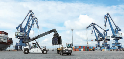 吊车和拖车在赤道几内亚巴塔市巴塔港作业。
