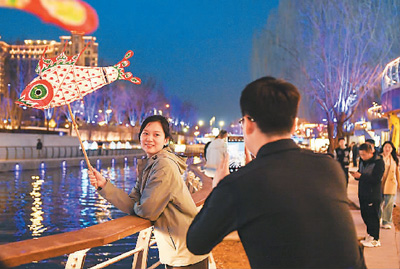 近年来,北京市朝阳区推动城市更新,打造了80万平方米的亮马河国际风情水岸,实现6公里航线通船,游船航线途经燕莎、蓝色港湾、红领巾公园等多处商圈、公园,已成为北京高质量发展的新亮点。图为3月16日晚,游客在亮马河畔观光休闲。